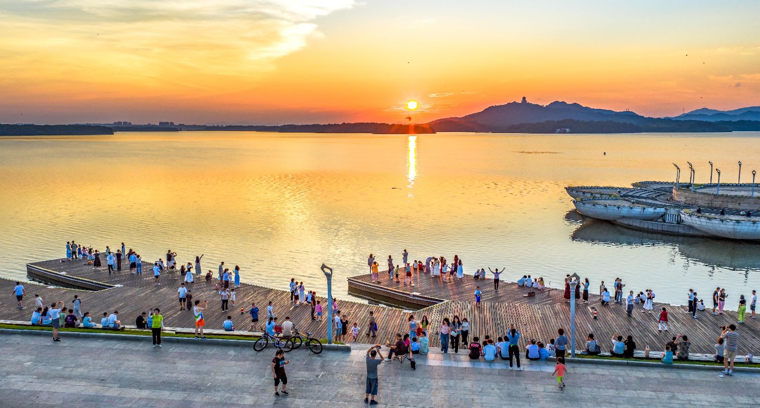 霞光映照下的平天湖景色绮丽,众多游客和市民带着孩子共赏绚丽的日出美景。(图片来源:何清 摄)