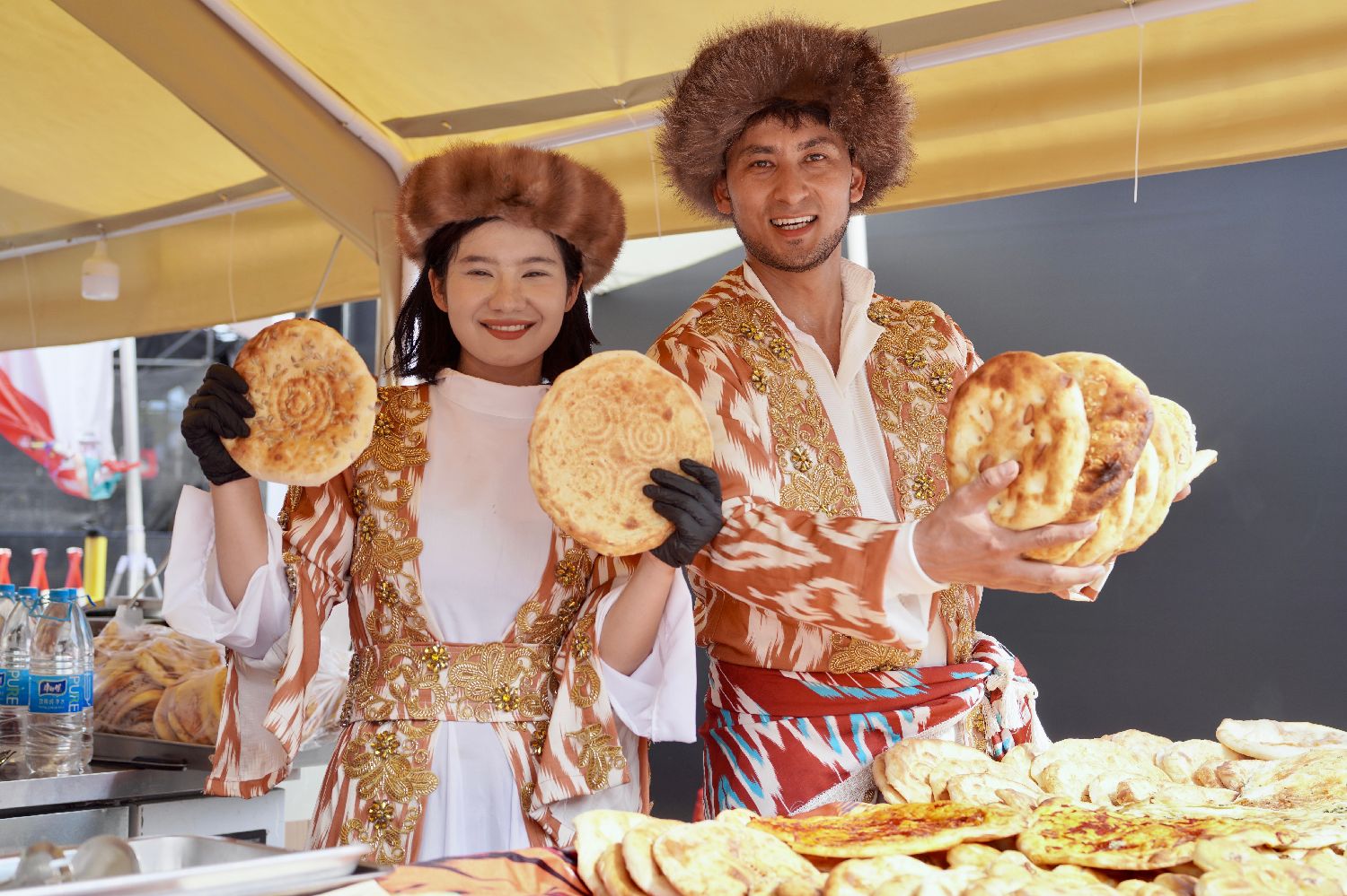 “不热,我们的帽子里有空调。”凯比努尔·艾力麦麦提打趣道,“我们希望穿着民族特色的服饰卖馕、卖烤包子,让大家品尝到新疆美食的同时了解维吾尔族、了解新疆,也希望吸引更多中外游客来新疆玩,看看我们中国的大好河山。”
