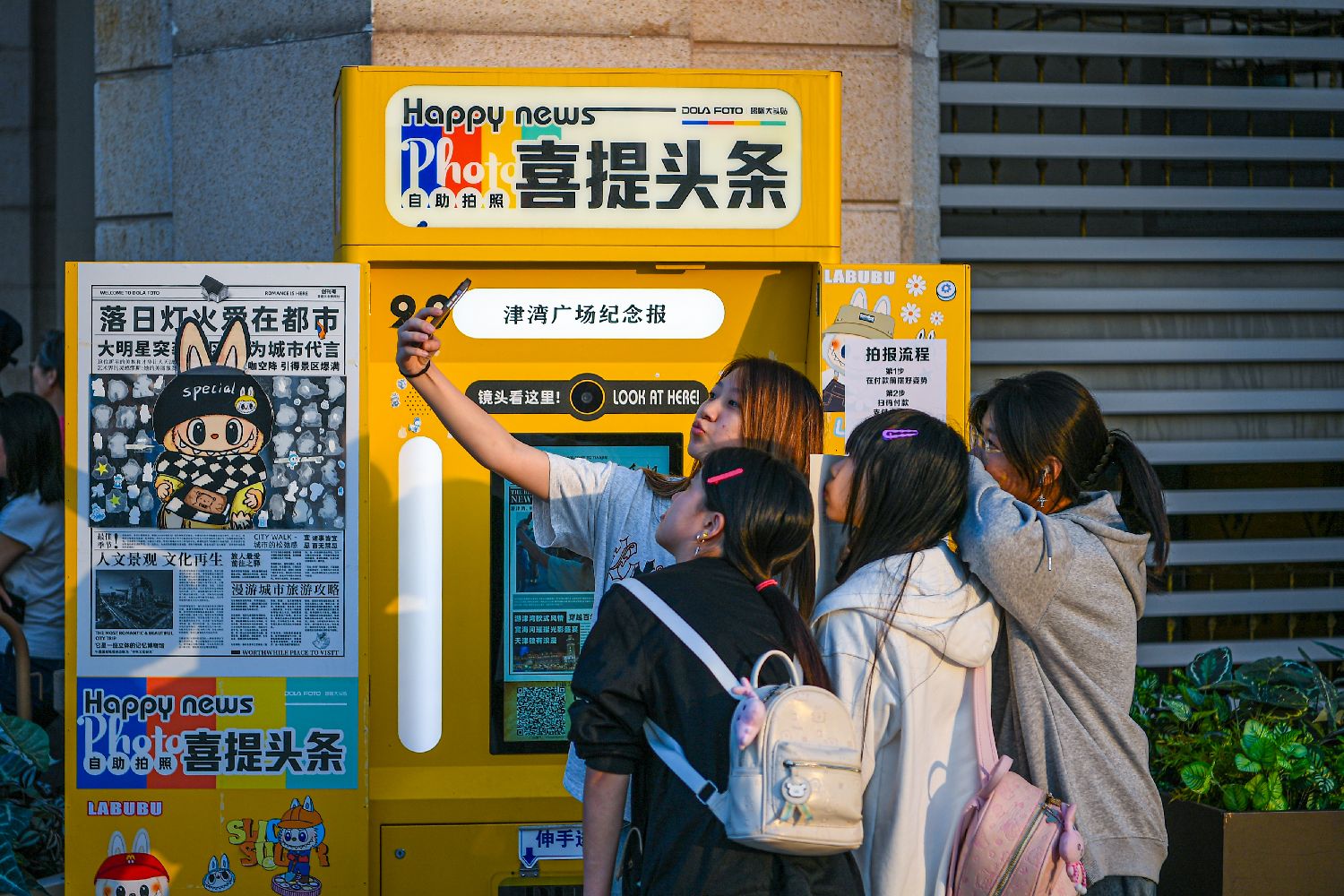 国庆中秋假期,天津津湾广场人头攒动。在一台“自助拍报机”前,游客对准镜头合影,几十秒后,一张仿报纸样式的纸张吐出,刚刚拍下的照片登上“头版头条”。