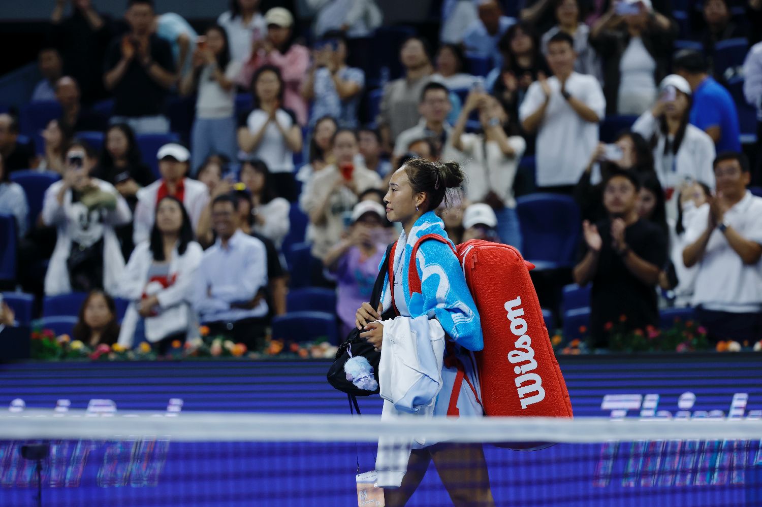 9月29日,在北京进行的2025中国网球公开赛女单第三轮中,中国选手郑钦文对阵捷克选手诺斯科娃,决胜盘中郑钦文因伤退赛。图为郑钦文走出赛场。(图片来源:中新社)