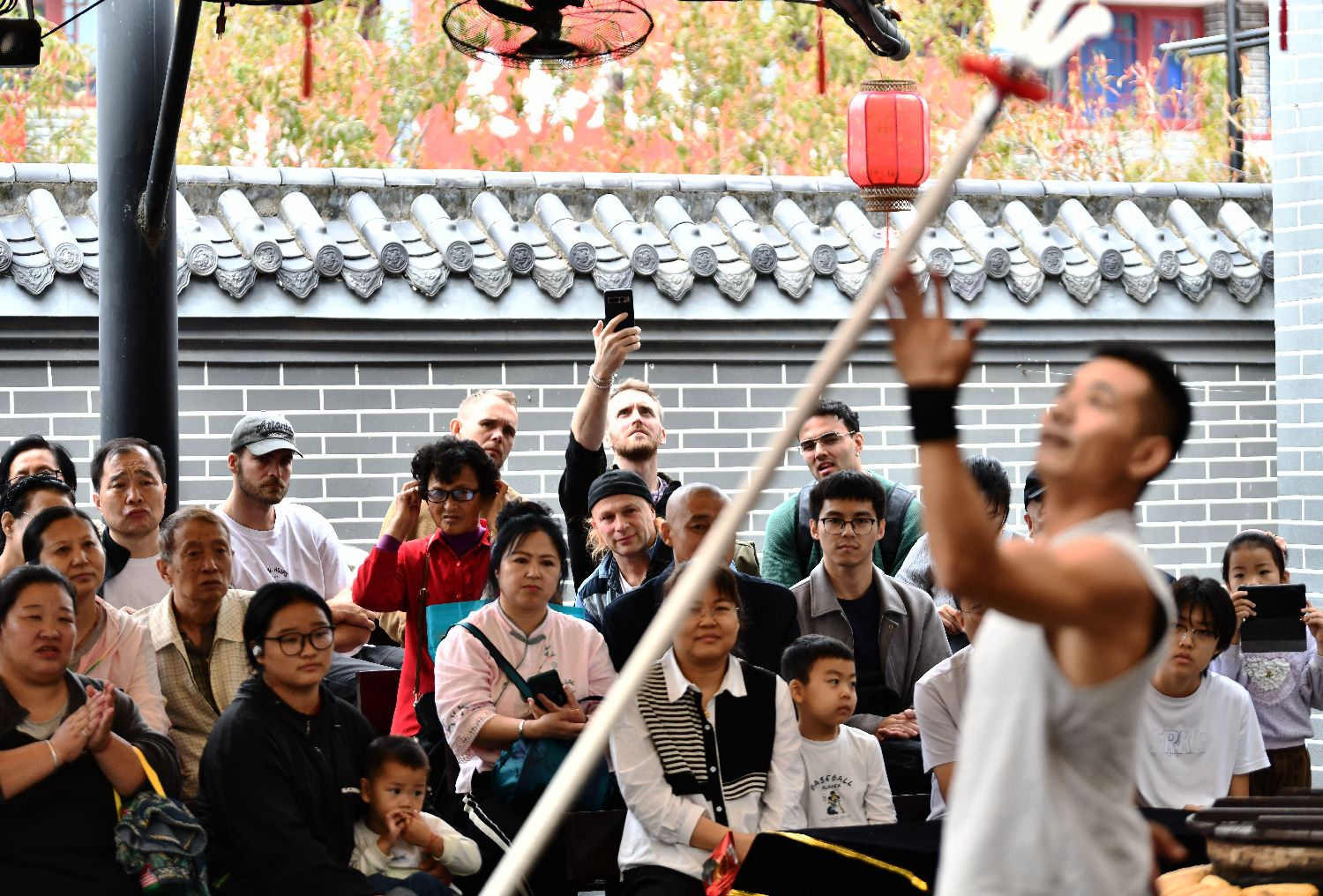 9月27日,在吴桥杂技大世界内,中外游客被飞叉表演吸引。(图片来源:中新社)