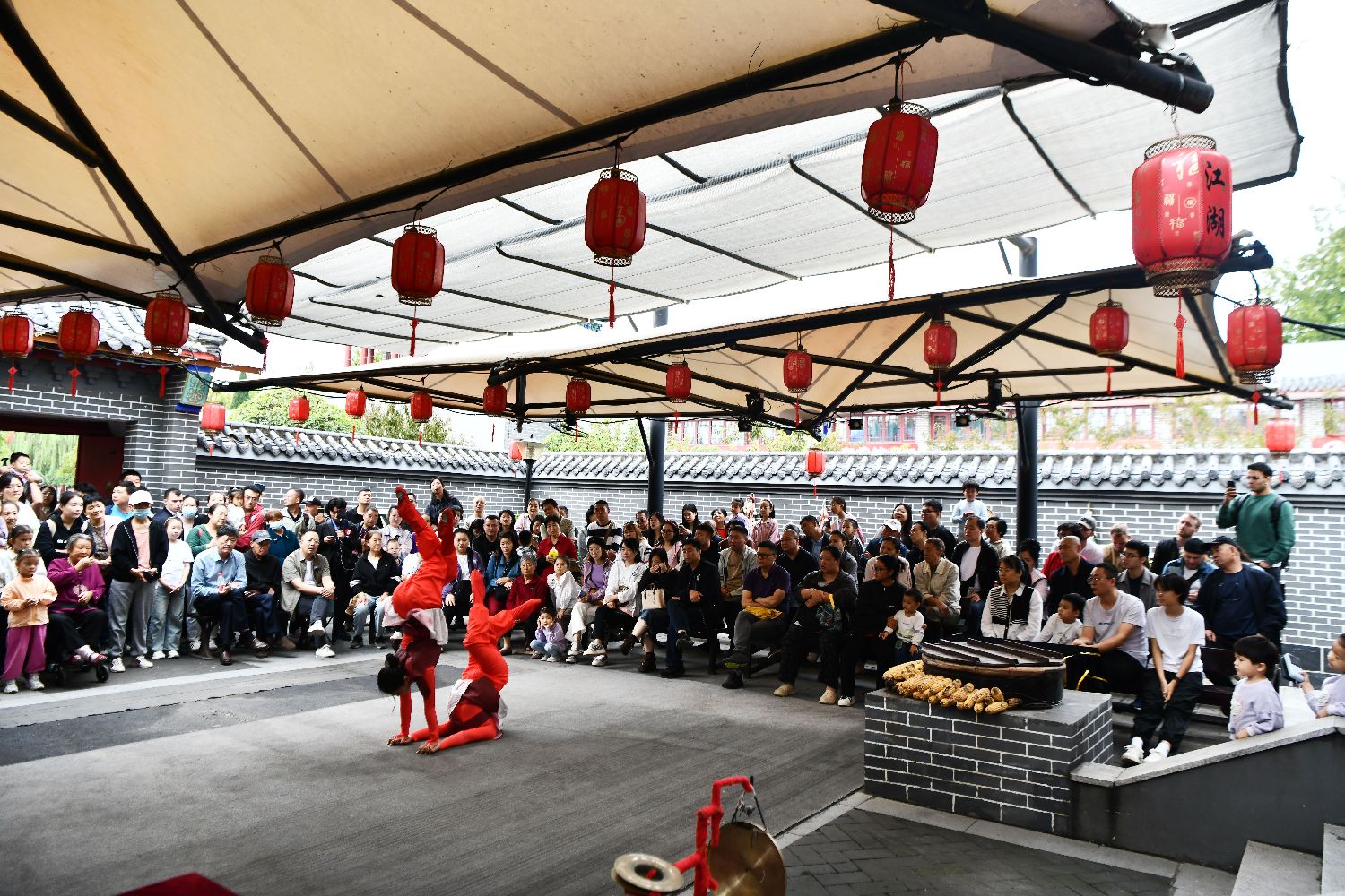 9月27日,杂技艺人在吴桥杂技大世界江湖文化城内献艺,表演者的“绝活”赢得阵阵掌声。(图片来源:中新社)