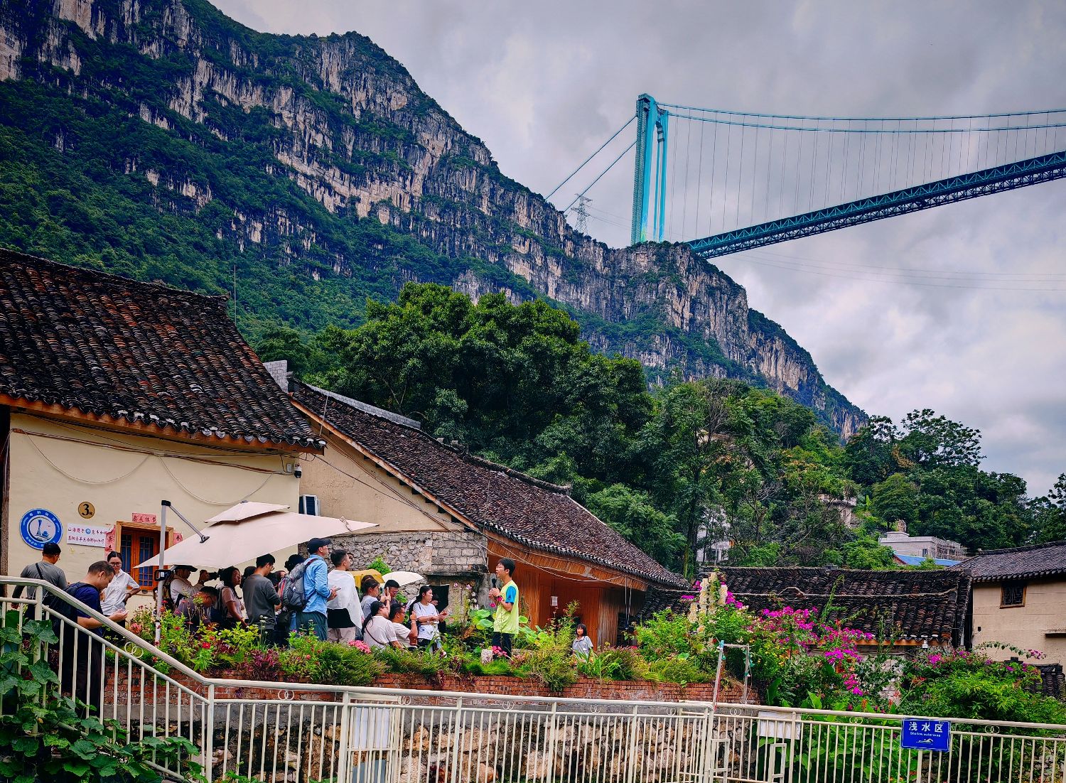 在花江村,记者看到不少游客悠闲地坐在青瓦灰墙的布依族传统民居前品茶观桥,或在村口的路边寻找最佳角度,留下“与大桥同框”的纪念照;更有游客信步走向村边的花江铁索桥,寻找角度拍摄这座曾是黔滇往来要道的古桥,与远处现代工程的杰作形成“新老同框”的独特画面。