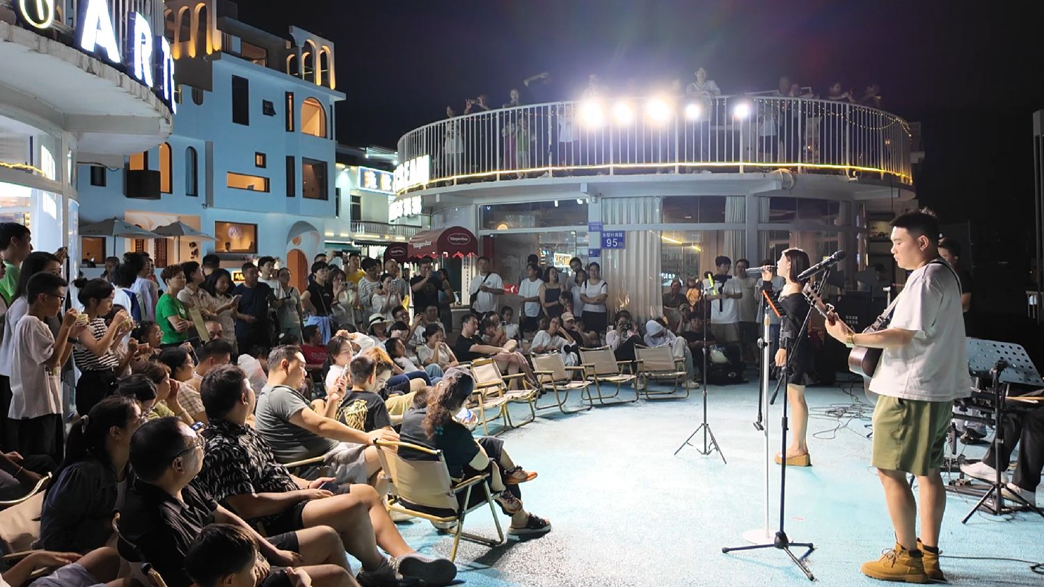 夜幕降临,浩瀚星空下、波光粼粼的海面之畔,悠扬的民谣歌声随风飘荡,本土音乐人用质朴的旋律演绎着三沙镇的风土人情与山海故事。其间不乏游客“亲身上阵”引吭高歌。