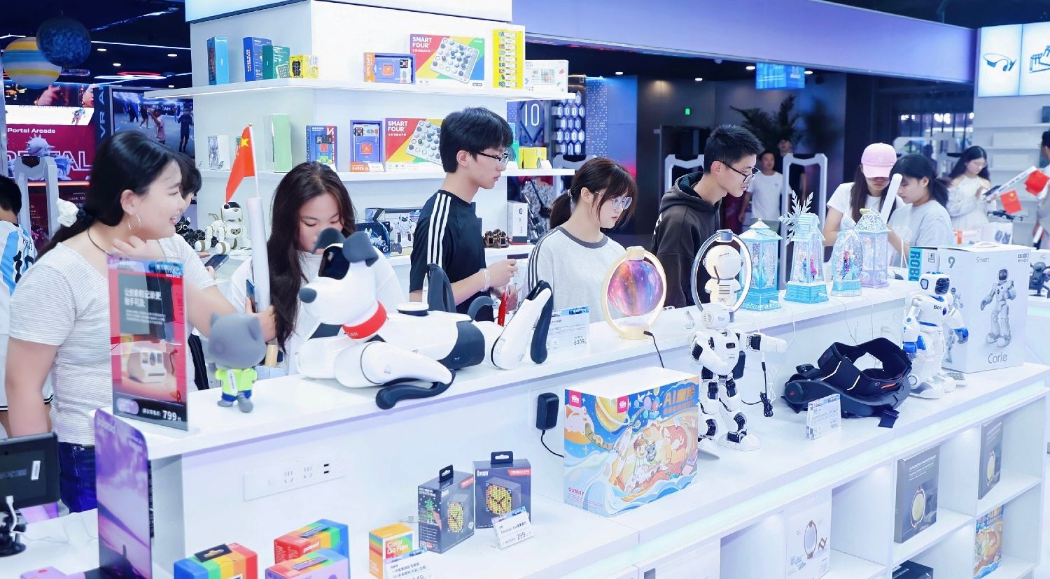 今年国庆中秋假期,杭州文三数字生活街区“科技新特产集合店”内,游客在选购伴手礼。(图片来源:文三数字生活街区供)