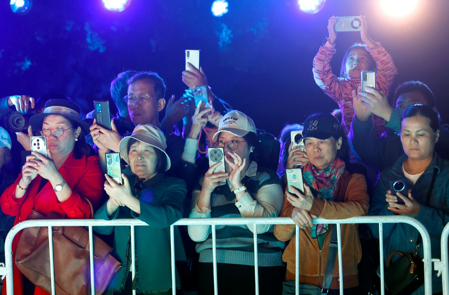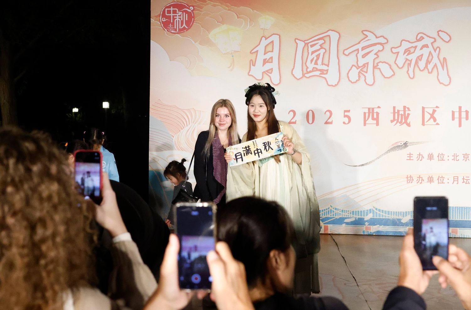 10月6日,外籍游客在北京月坛公园与身穿汉服的工作人员合影。当日,中国传统节日——中秋节,“月圆京城·情系中华”中秋游园活动在北京月坛公园举行。活动以“光影互动”“文艺演出”“非遗、文创、美食市集”“沉浸游园”等多元板块,串联起传统与现代交织的节日图景,让市民与游客沉浸式感受中华传统文化的魅力。活动现场,数组自贡主题花灯璀璨亮相,结合主题灯光造型装饰,为游客营造出文化与科技融合的中秋光影体验。