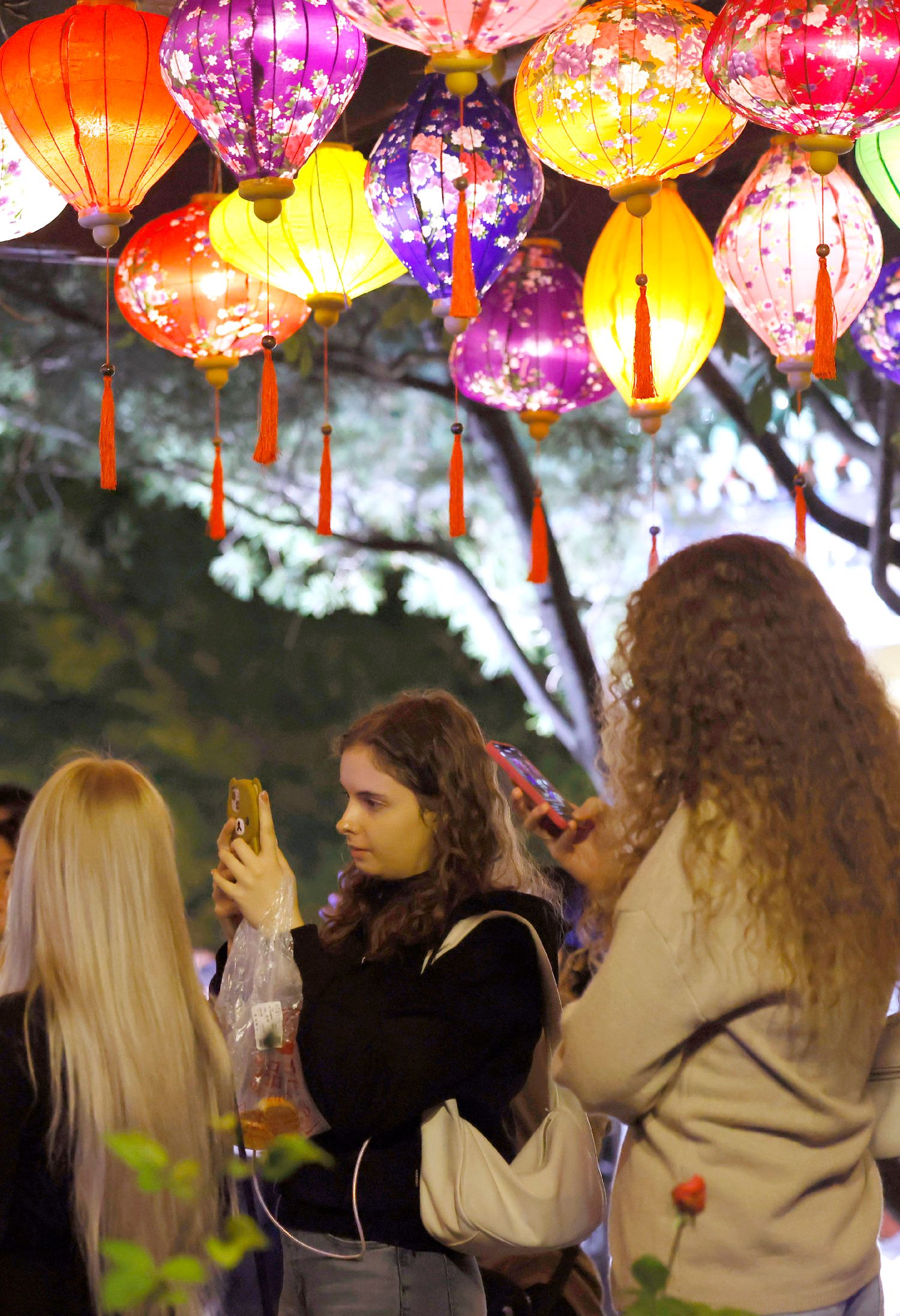 外籍游客在北京月坛公园赏花灯、过中秋。