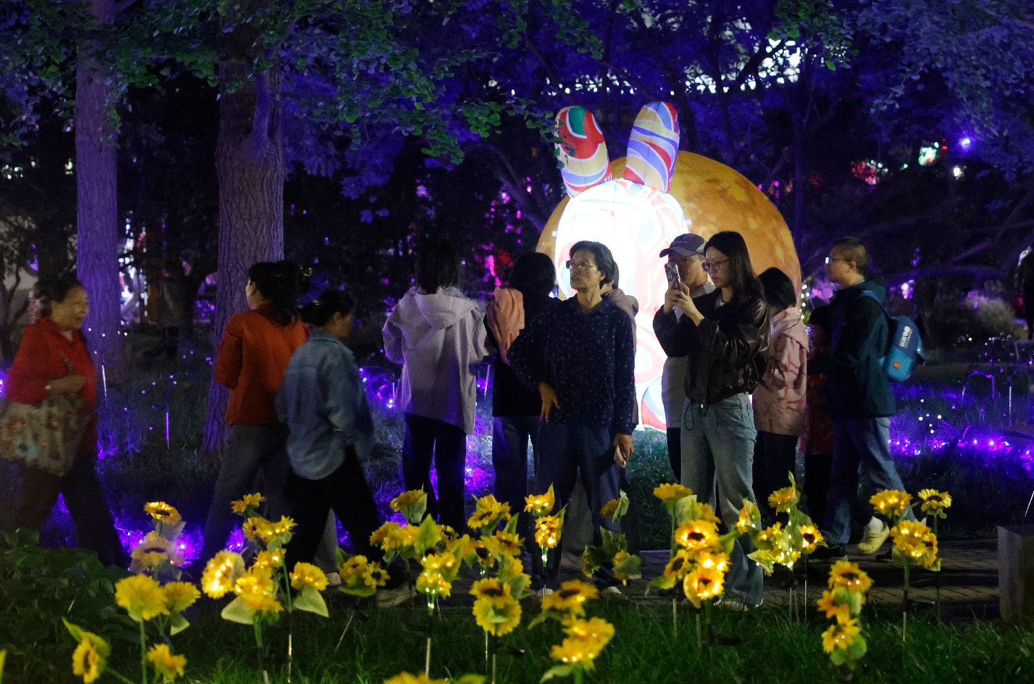 10月6日,夜幕降临,游客在北京月坛公园游园赏花灯。