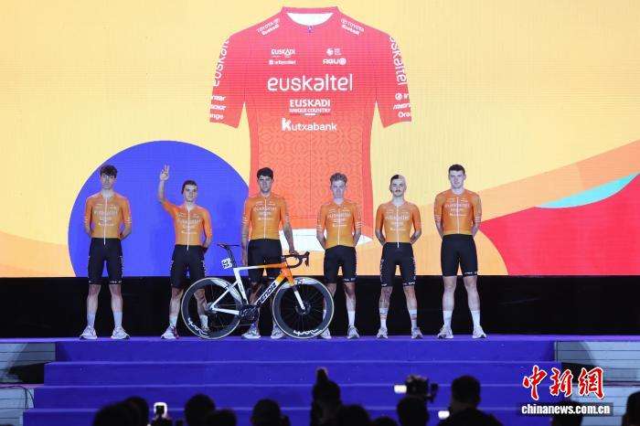图为西班牙巴斯克电信车队的车手们登台亮相。