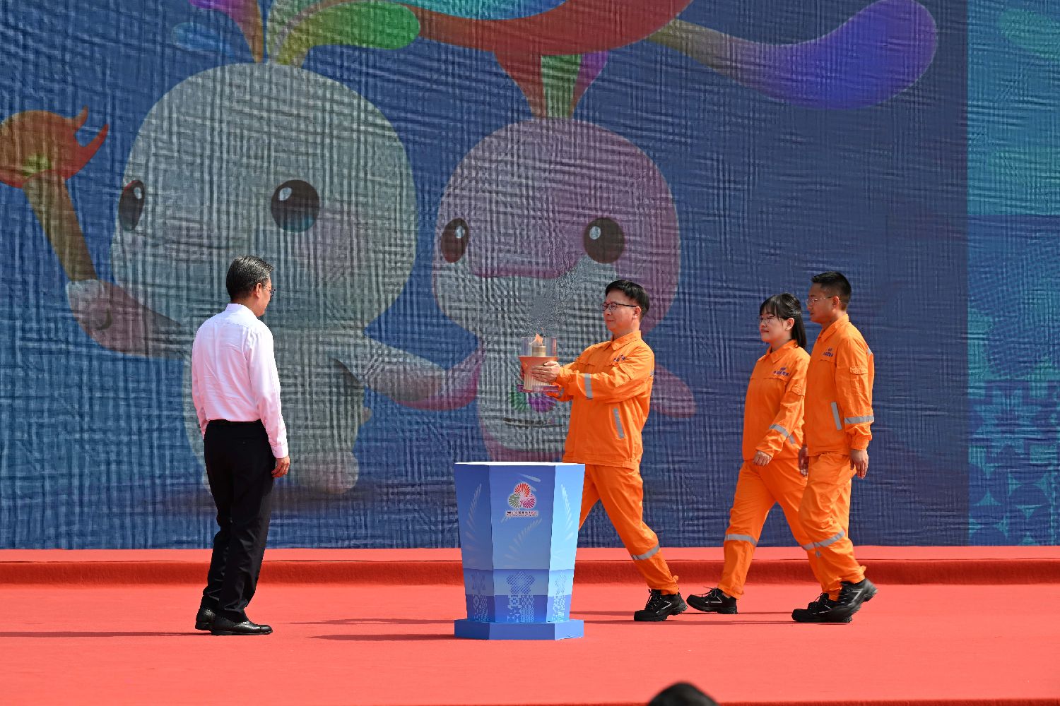 10月9日,负责深海采火技术研发的海洋科研工作者代表手捧从深海采集的“源火”抵达现场。