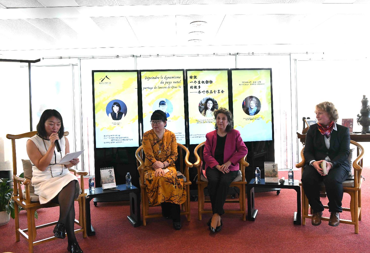2024年4月,中国女作家乔叶(左二)作品分享会在巴黎中国文化中心举行,与会人员围绕乔叶作品《宝水》进行交流。(资料图)(图片来源:中新社)
