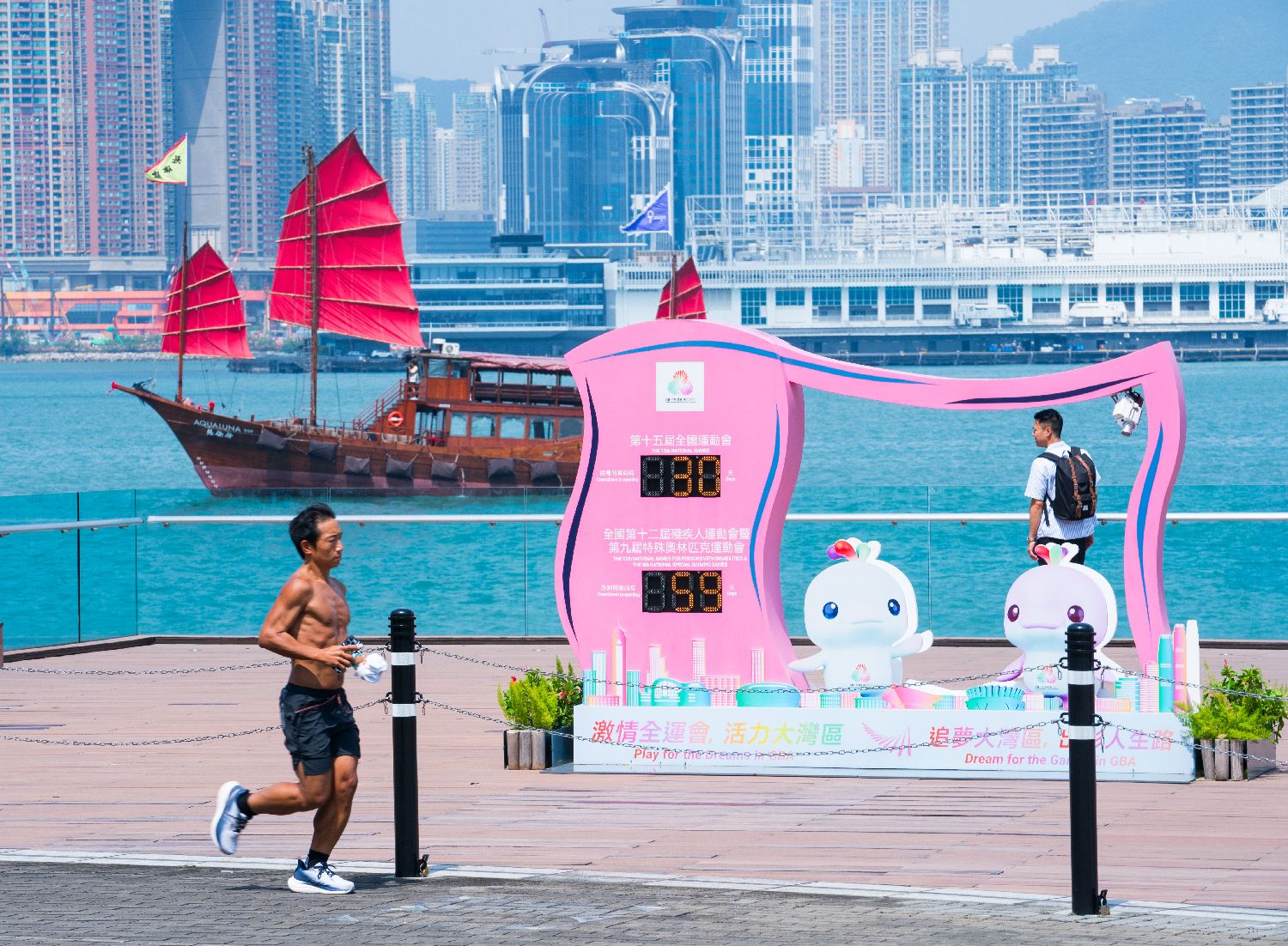 10月10日,首次由粤港澳三地共同承办的全国运动会——第十五届全运会迎来开幕倒计时30天。图为香港金钟添马公园设置的全运会倒计时牌显示天数信息。(图片来源:本文图片均自中新社)