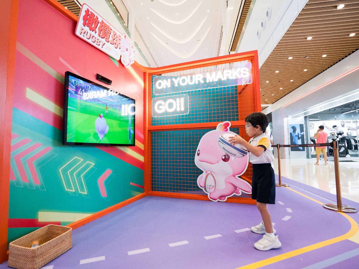 10月10日,香港湾仔一家商场的“全运大派对”活动区内,一名小朋友体验将在香港举行的橄榄球项目的游戏。