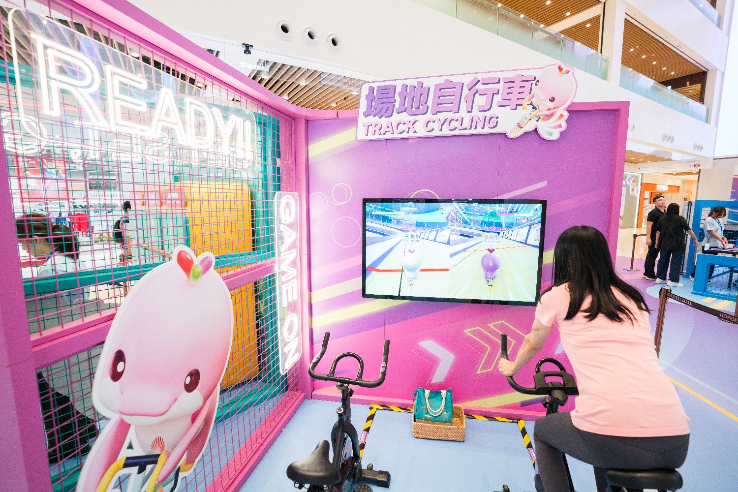 10月10日,香港湾仔一家商场的“全运大派对”活动区内,市民体验将在香港举行的场地自行车项目的游戏。