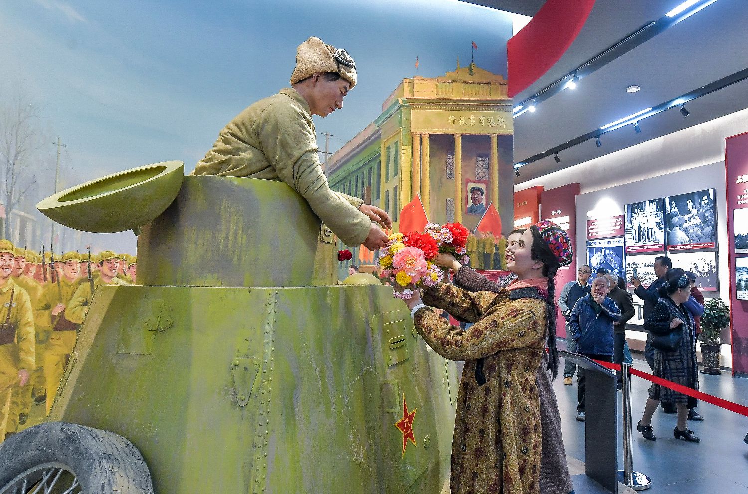 展区占地5500余平方米,汇集1600余幅图片、1400余件实物模型、150多个多媒体视频和场景还原,展现了天山南北70年的沧桑巨变。(图片来源:中新社)