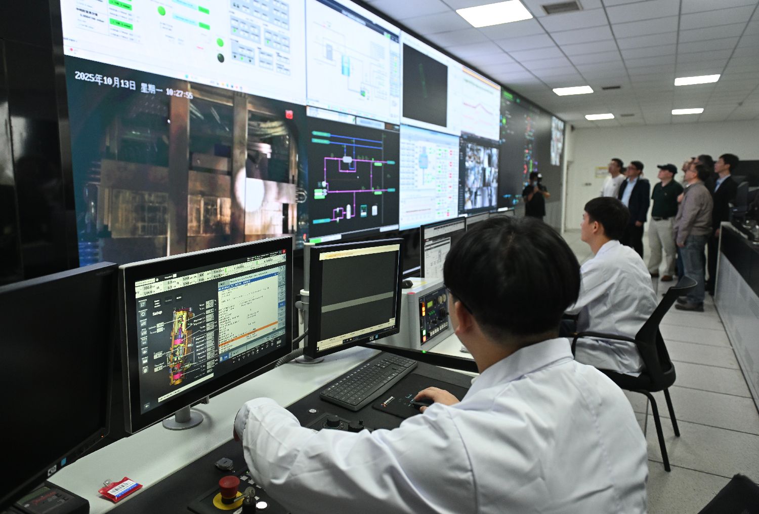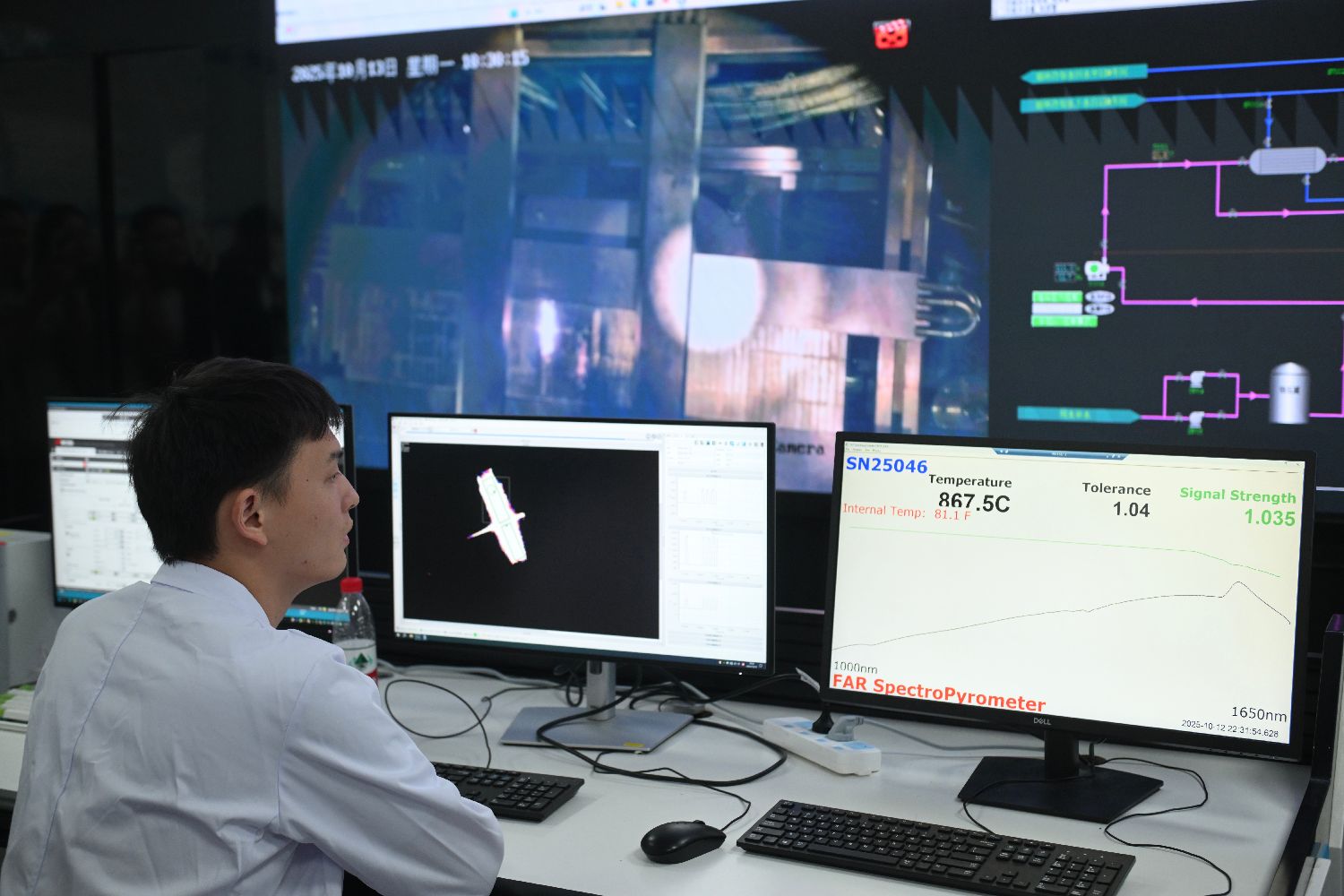 此次研制成功的偏滤器原型部件,不仅是国际上尺寸最大的同类部件,更具备20兆瓦每平方米的超高稳态热负荷能力,达到了当前工程材料承受温度的极限,相当于给聚变堆打造了一面“超级盾牌”。图为科研人员进行现场测试。(图片来源:本文图片均自中新社)
