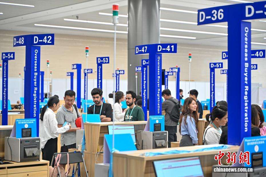 10月13日,参展人员在广交会展馆内办理证件。(图片来源:中新网)