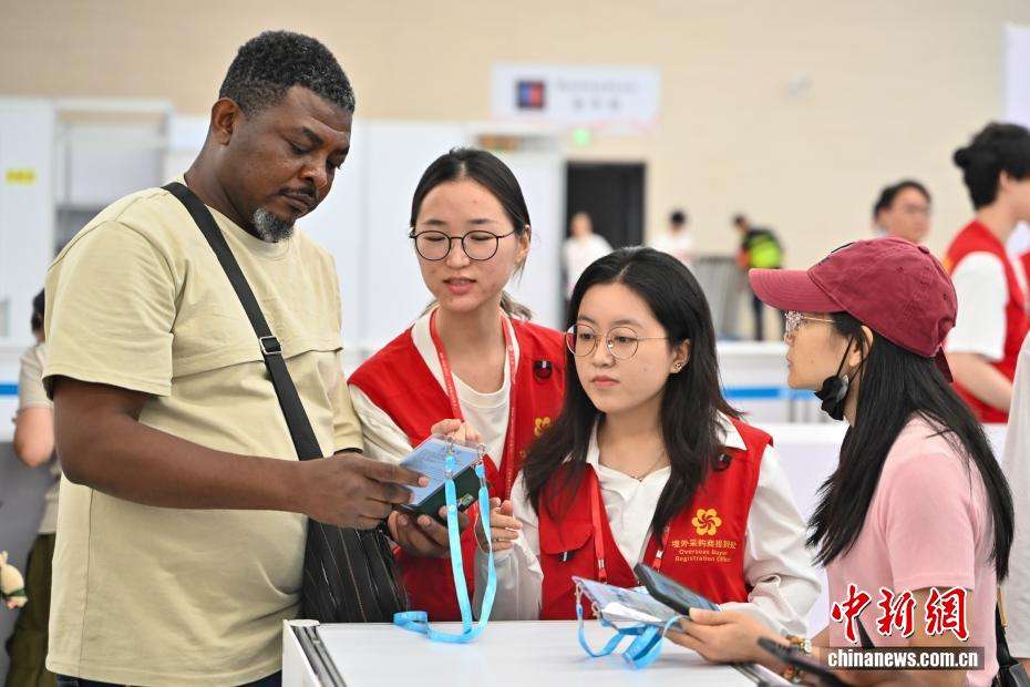 10月13日,广交会工作人员协助采购商办理证件。(图片来源:中新网)