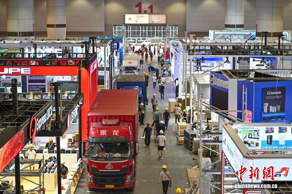 10月13日,工作人员在广交会展馆内布展。(图片来源:中新网)