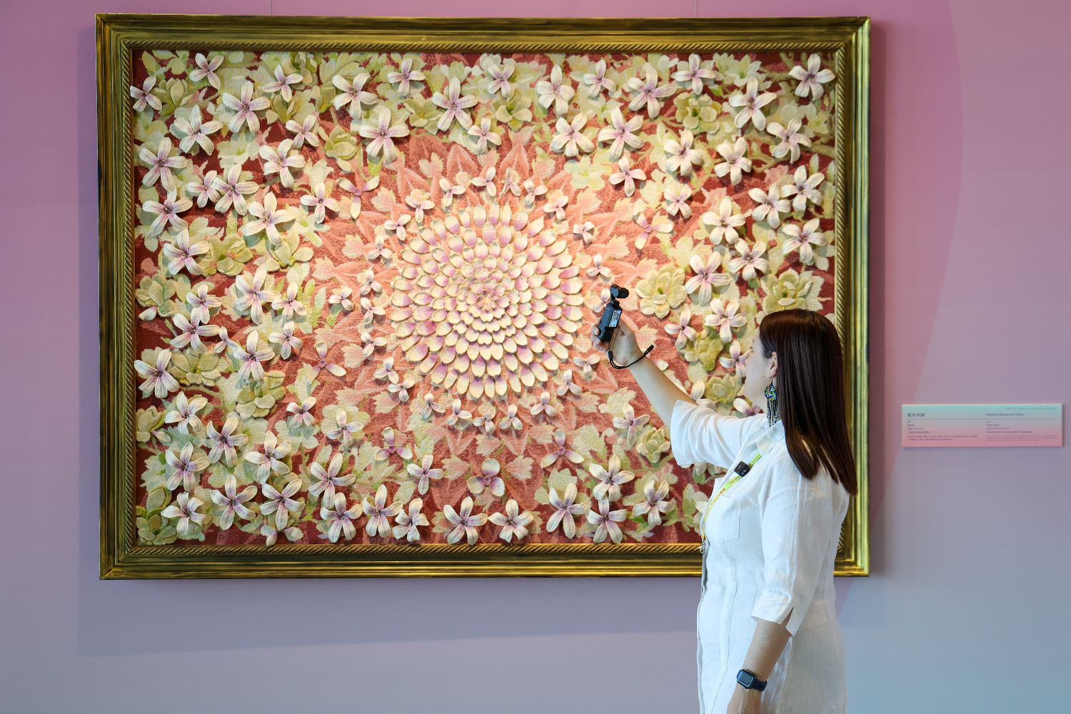 10月13日,一名外国女记者拍摄全球妇女峰会女性主题特展“华韵承芳·非遗共赏”。(图片来源:本文图片均据新华社)