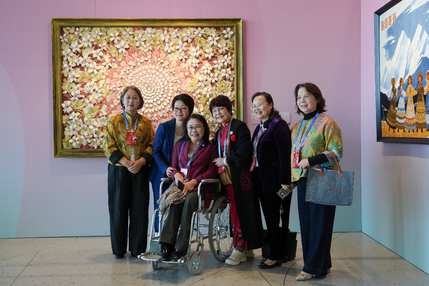 10月13日,参会的张海迪等嘉宾在全球妇女峰会女性主题特展“华韵承芳·非遗共赏”上合影。
