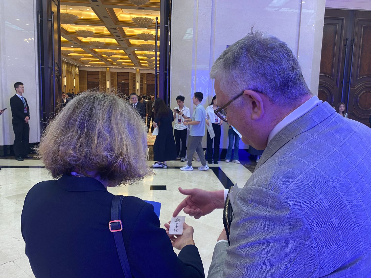 图为两位汉学家在会场外讨论纸条上写着的汉字。