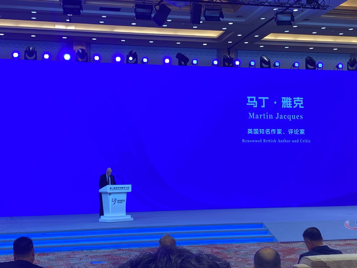 图为英国知名作家、评论家马丁·雅克在主论坛上发表题为《全球视野下的历史中国与当代中国》讲话。他指出,(中国学)研究的出发点只能是基于中国自身的国情来理解中国,而不是否认中国的特殊性及其深厚的历史与当代差异性。