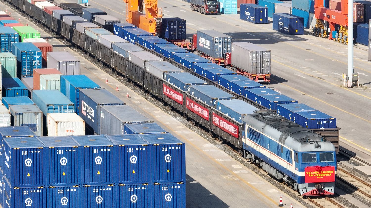 10月13日,伴随嘹亮悠长的鸣笛声,一列满载家电产品、汽车配件等货物的中亚班列从中铁天津集装箱中心站出发,将经由霍尔果斯口岸出境,驶向哈萨克斯坦等地。图为10月13日拍摄的天津-中亚图定班列首发现场。(图片来源:本文图片均自新华社)