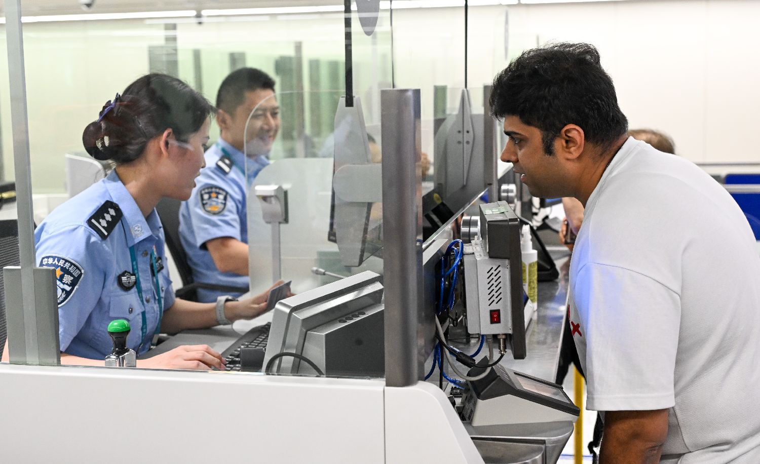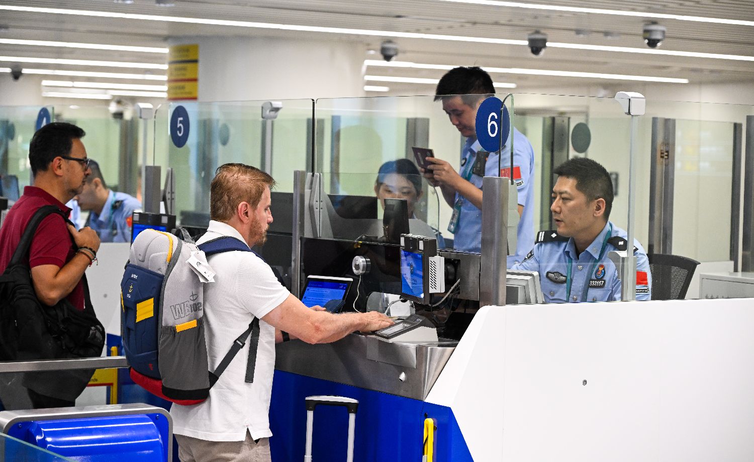 10月15日,在海口美兰边检站,海南2025年第200万名通关外籍旅客卡迪克(右)在办理边检手续。