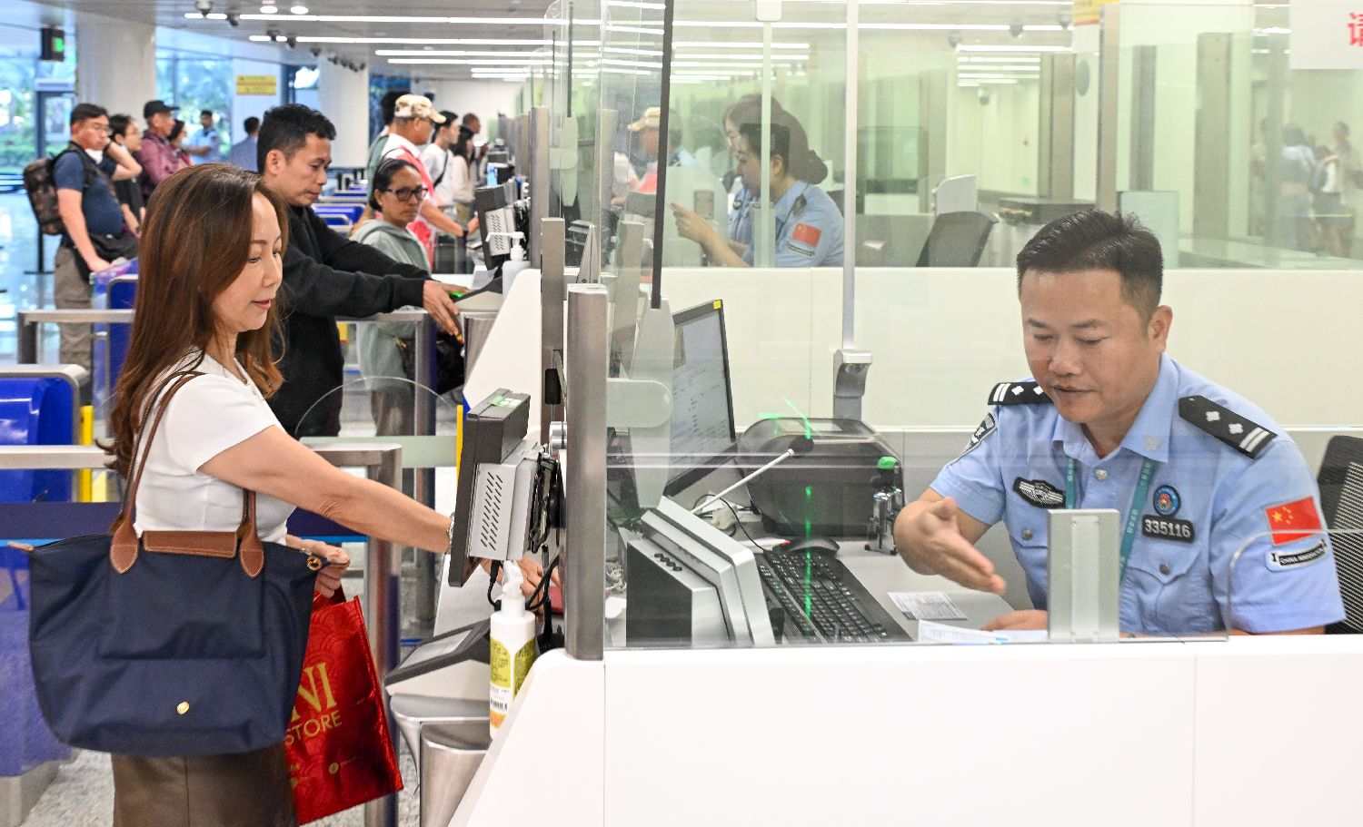10月15日,入境旅客在海口美兰边检站办理边检手续。