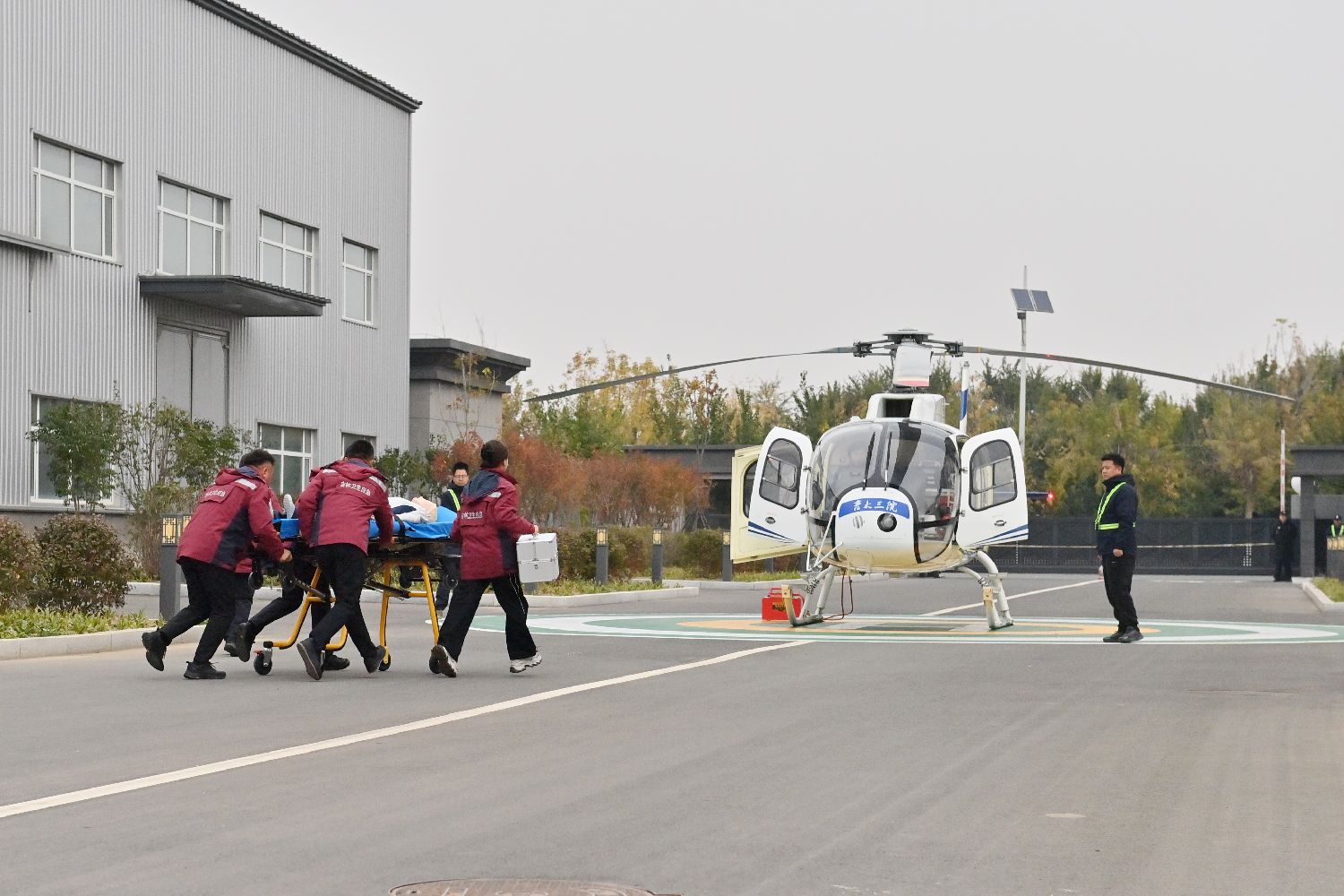 10月15日,在吉林长春,急救人员在进行直升机航空紧急医学救援演练。当天,中国国家紧急医学救援基地(吉林)立体转运中心移动医院正式交付。(图片来源:中新社)