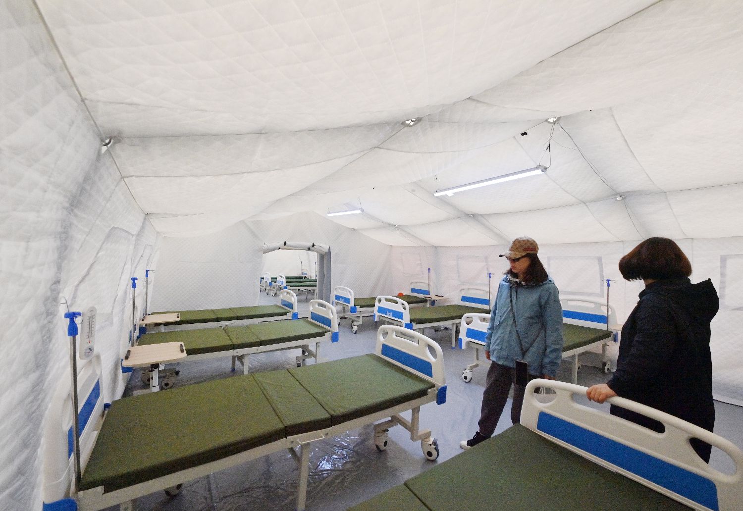 该移动医院由吉林大学中日联谊医院承建,配备通信指挥车、移动CT车、手术车等14类15台应急车辆及43组帐篷,设200张床位,日均接诊能力达800-1000人次。图为10月15日,参观者在参观移动医院病房帐篷。(图片来源:中新社)