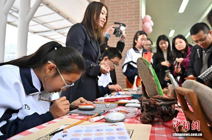 图为学生体验绘制石画。