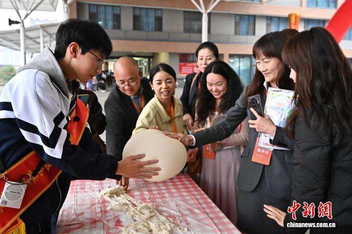 图为学生吹制的“面气球”吸引参观者触摸。