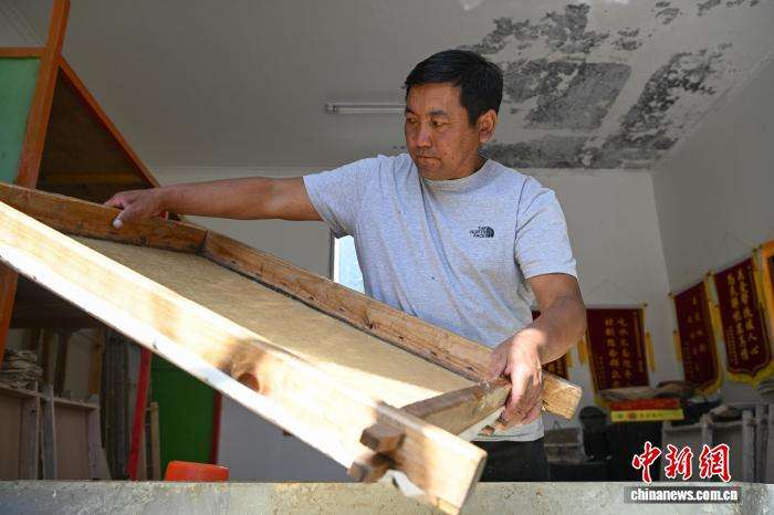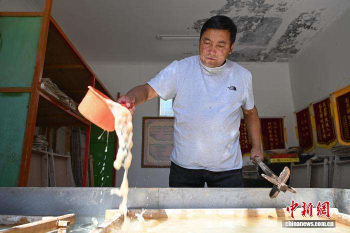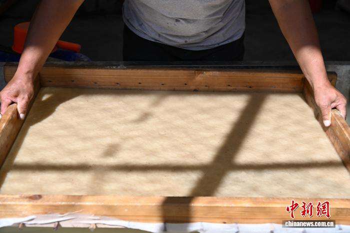 据悉,藏纸传承至今已有1300多年历史,雪拉藏纸作为西藏三大藏纸之一,其特殊原料配方造就“虫不蛀、鼠不咬、不腐不变色”的特性,用它印制的文史经典千余年完好如初。图为尼木雪拉藏纸农牧民专业合作社员工在制作藏纸。(图片来源:本文图片均来自中新网)