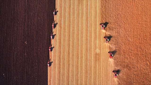 (一侧是小麦收割,一侧是旋耕机在耕地)