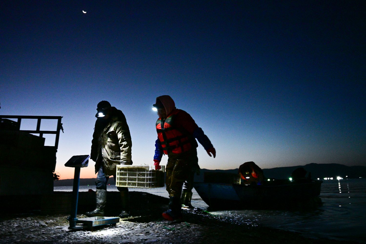 近年来,龙羊峡库区乡镇以小银鱼捕捞为核心,带动加工、运输等环节协同发展,并凭借库区生态优势发展民宿经济,“渔业+加工+文旅”的融合产业链正逐步形成。图为10月18日,库区渔民将一箱刚捕捞的小银鱼上秤称重。