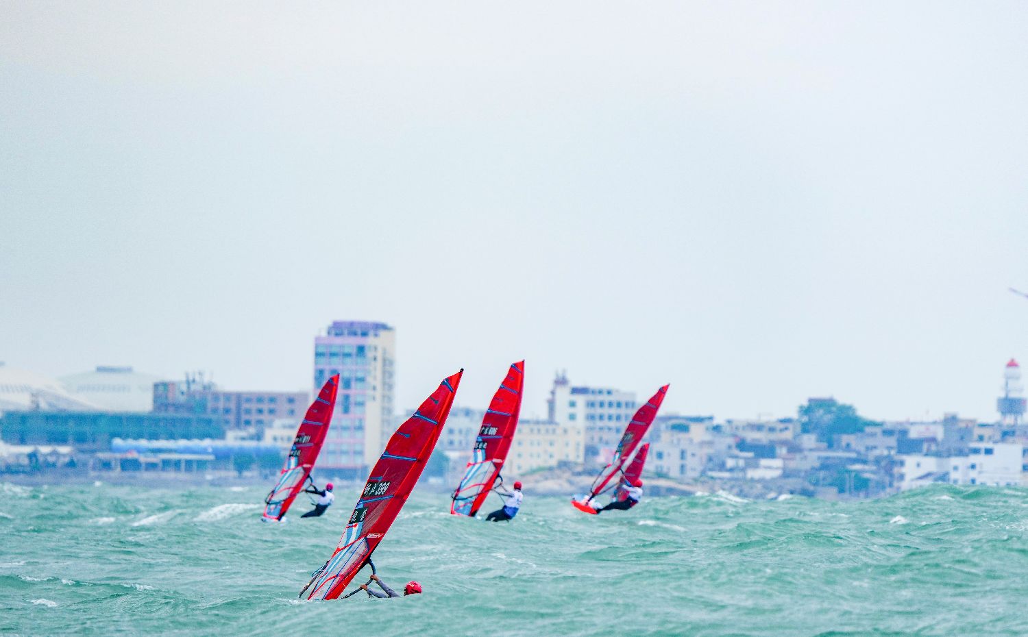 10月20日,参赛选手在女子水翼帆板级比赛中。当日,第十五届全运会帆船项目第一阶段比赛在广东省汕尾市举行。(图片来源:本文图片均自新华社)