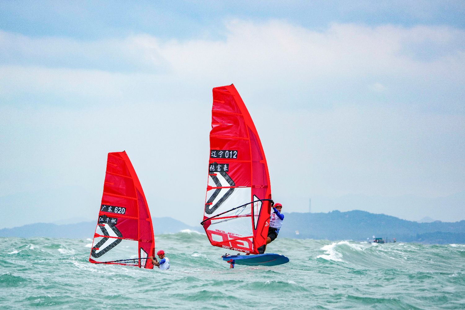 10月20日,辽宁队选手张富豪(右)和广东队选手江千帆在男子水翼帆板级比赛中。