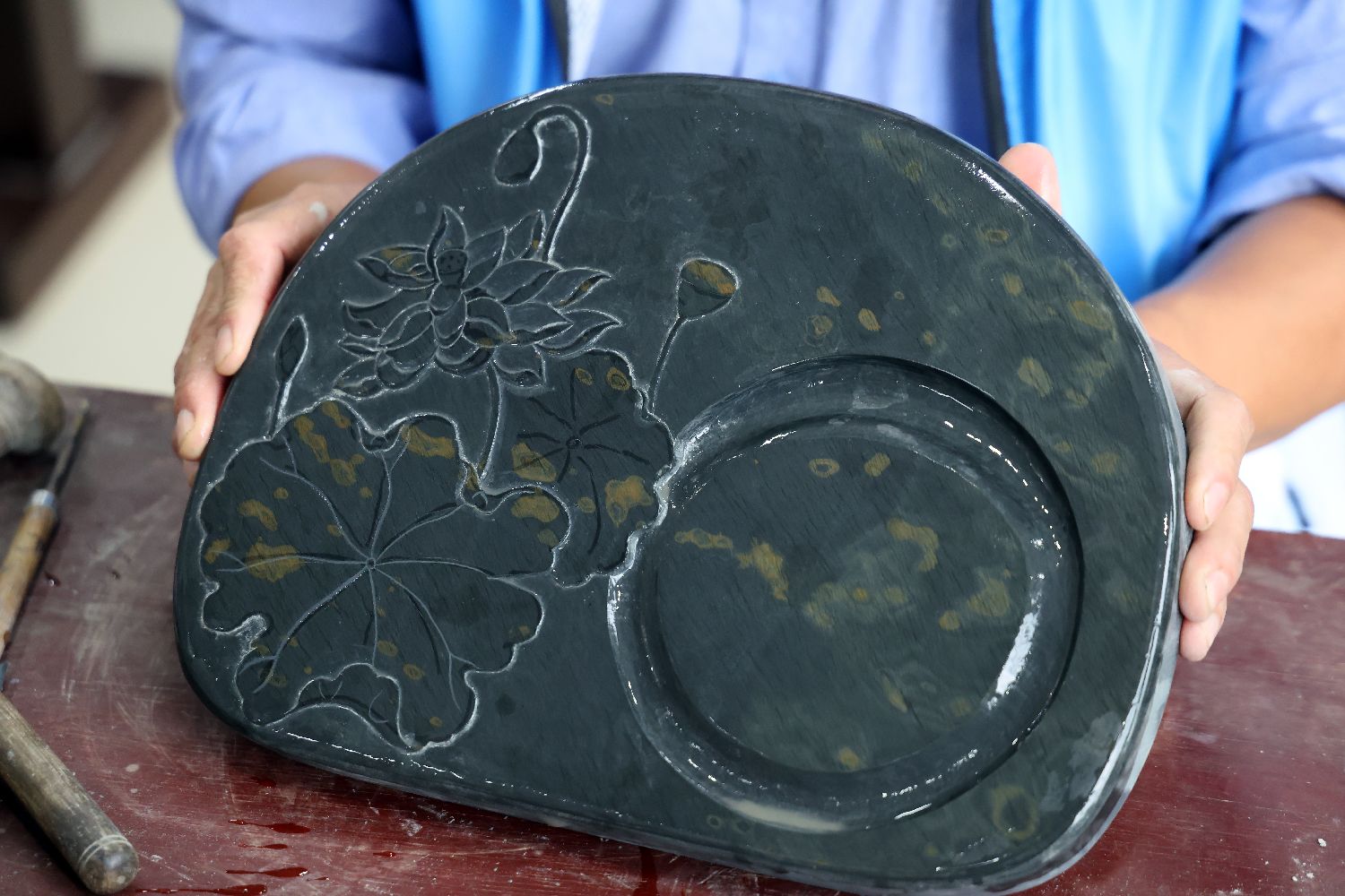 金星砚又名金星宋砚,主产在江西省庐山市横塘镇驼岭山下。2006年,金星砚制作技艺被列入第一批国家级非物质文化遗产名录。图为10月20日拍摄的庐山金星砚作品“荷香图”。