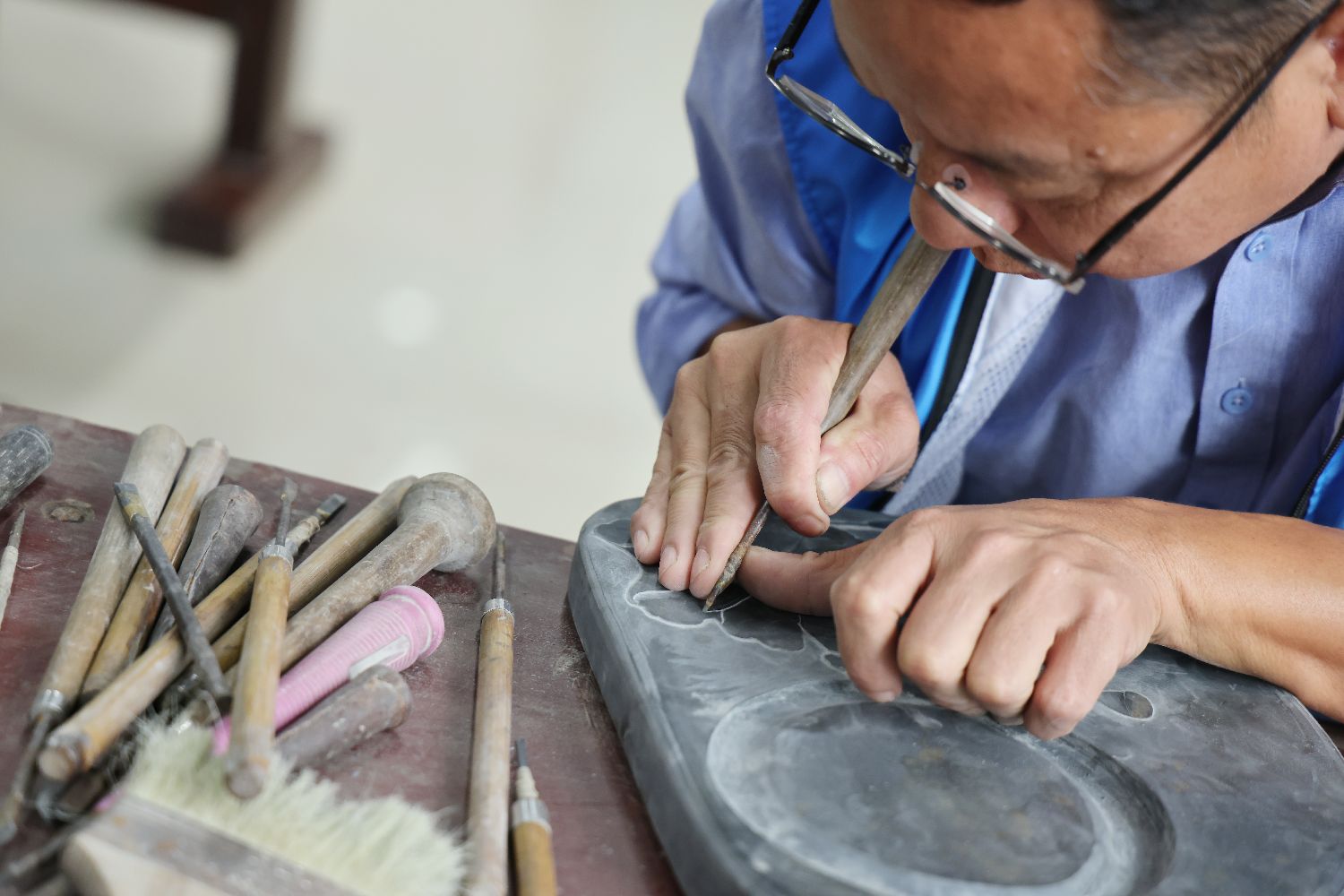 10月20日,金星砚制作技艺国家级非物质文化遗产代表性传承人李平汉在位于江西庐山秀峰景区的工作室制作金星砚。