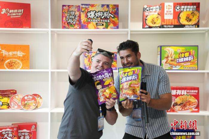 图为采访团成员对着镜头介绍柳江区企业生产的螺蛳粉。
