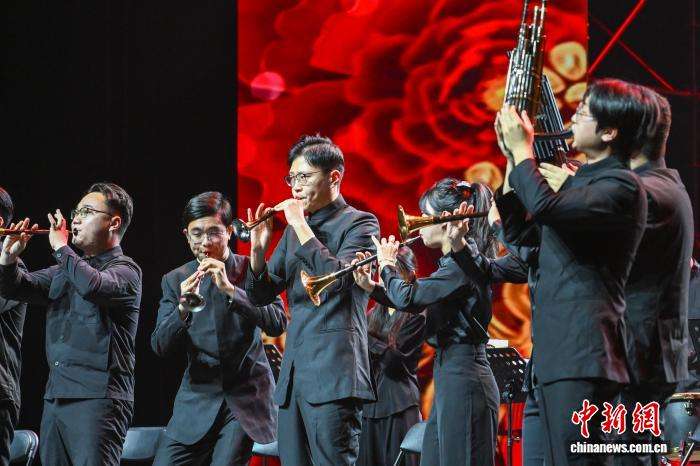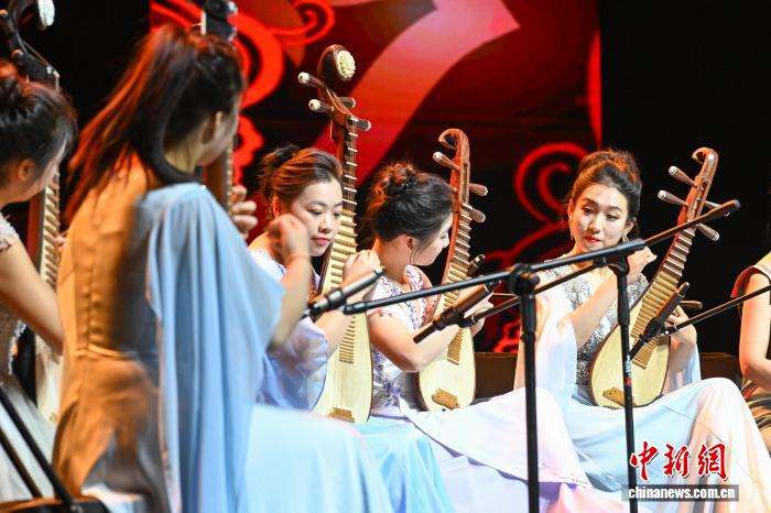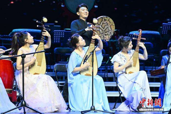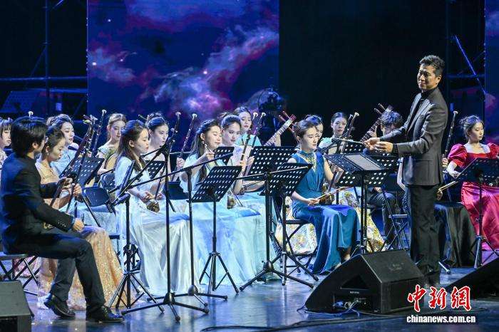 图为中央音乐学院弹拨乐团表演弹拨乐合奏《天边情歌》。