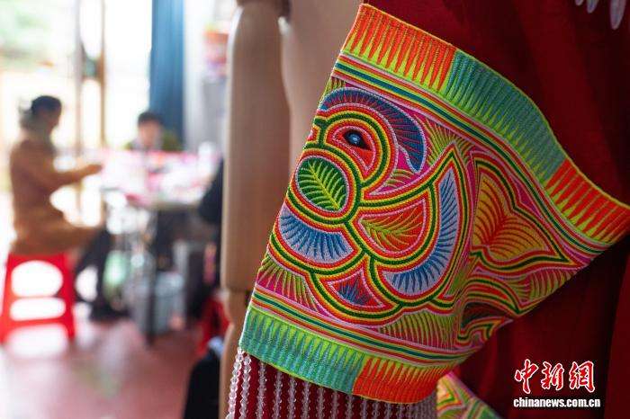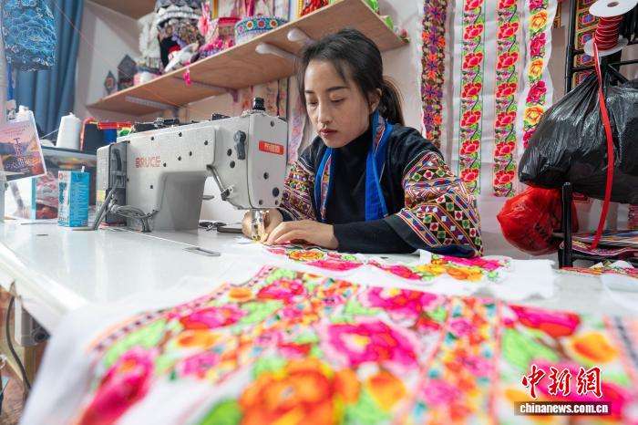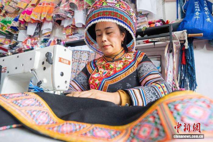 10月21日,在贵州省毕节市七星关区柏杨林街道“巧姊妹”非遗工坊里,绣娘正在制作民族服饰。(图片来源:本文图片均自中新网)