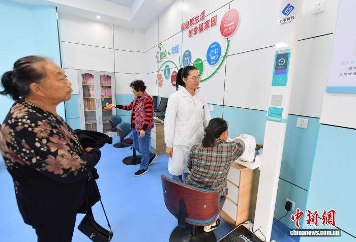 图为医务人员在社区健康小屋为老人量血压、测血糖,老人们一些小的头痛脑热不出社区就可以解决。