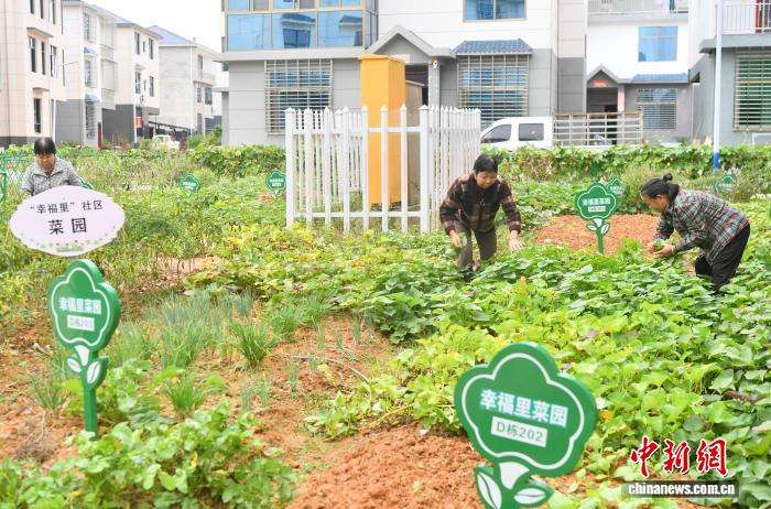 图为老人在社区菜园采摘种植的蔬菜。