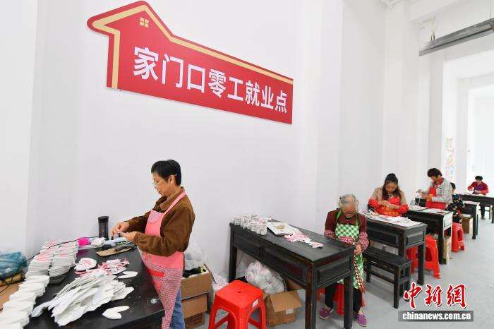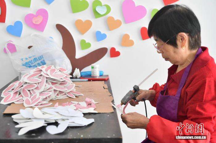 图为老人在社区零工市场做手工,增加一些生活补贴。