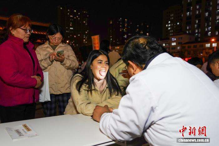 图为外国友人在夜市现场接受诊疗。
