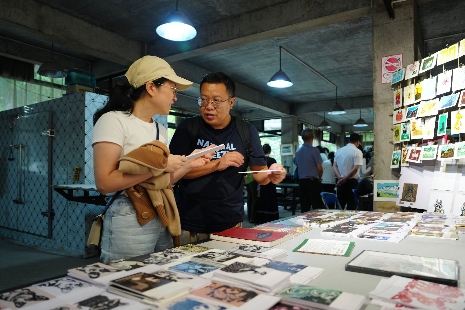 10月22日,在云南普洱学院那柯里绝版木刻教学实践基地,游客在讨论绝版木刻作品。