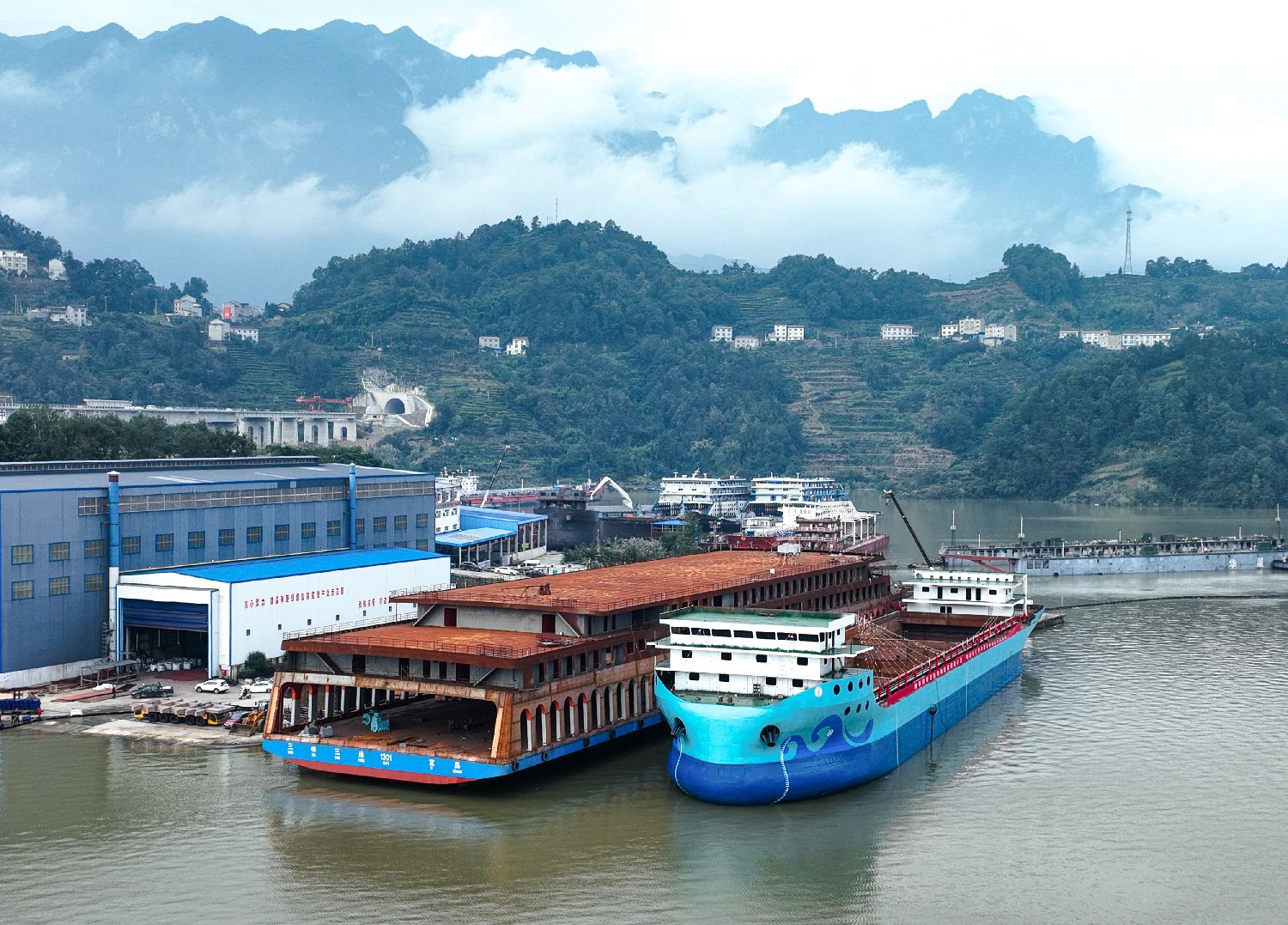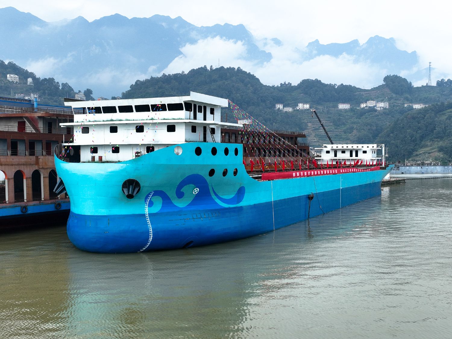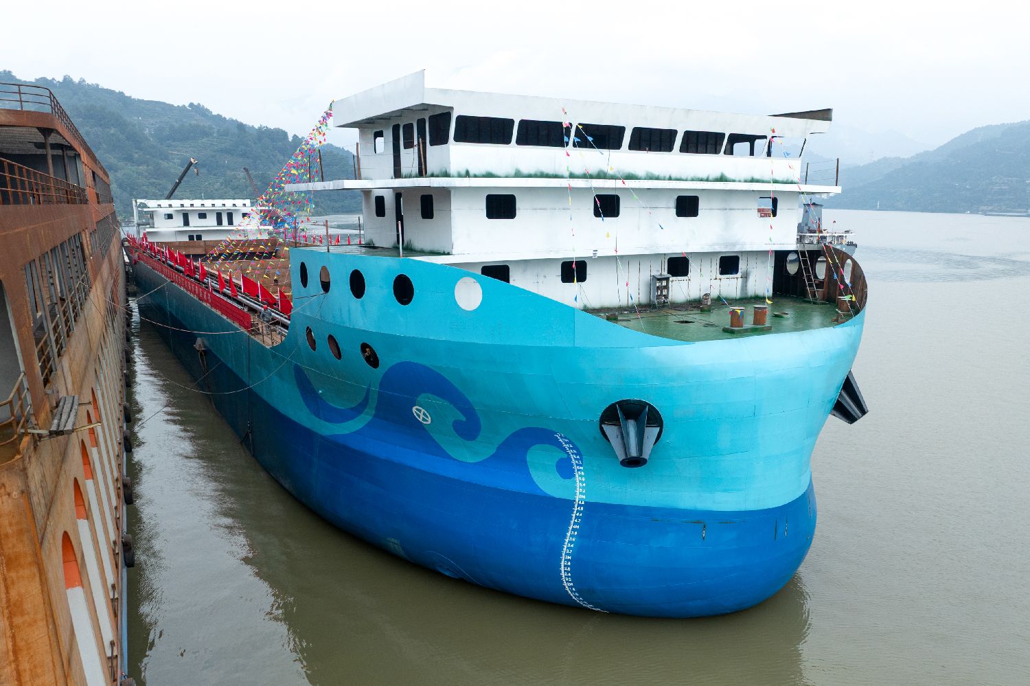 万吨级纯电动散货船在湖北宜昌下水舾装